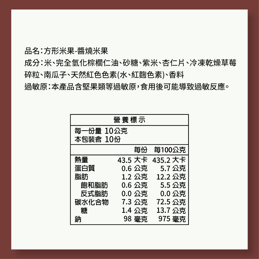 ►採用台灣在地 71 號霧峰香米,米香濃郁 ►嚴選花蓮新味醬油,天然釀造、鹹香回甘 ►無人工添加物,簡單食材呈現純粹風味 。10片裝