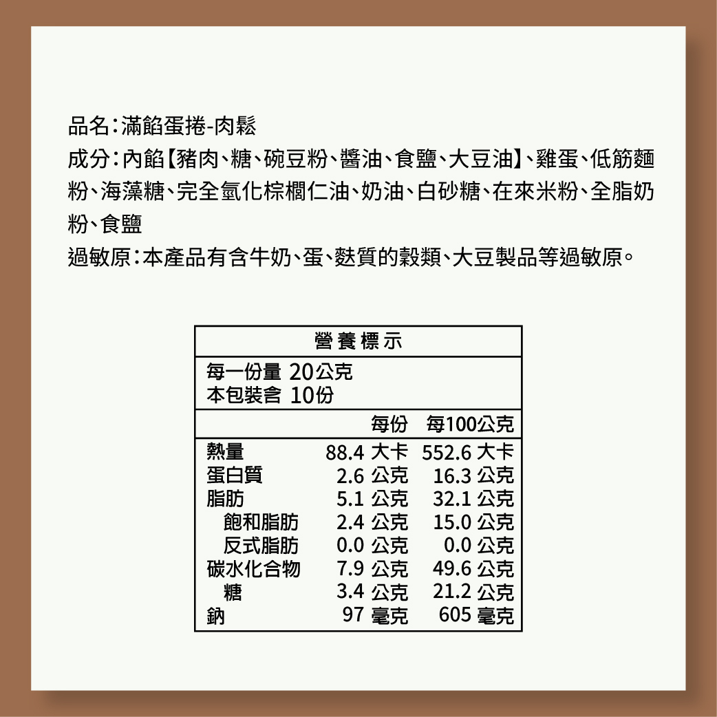 ►厚餡肉鬆飽滿不空虛,鹹香十足 ►蛋捲酥而不碎,口感滑順不卡喉 ►肉鬆酥鬆入口即化,搭配餅皮完美融合 (18gx10支)