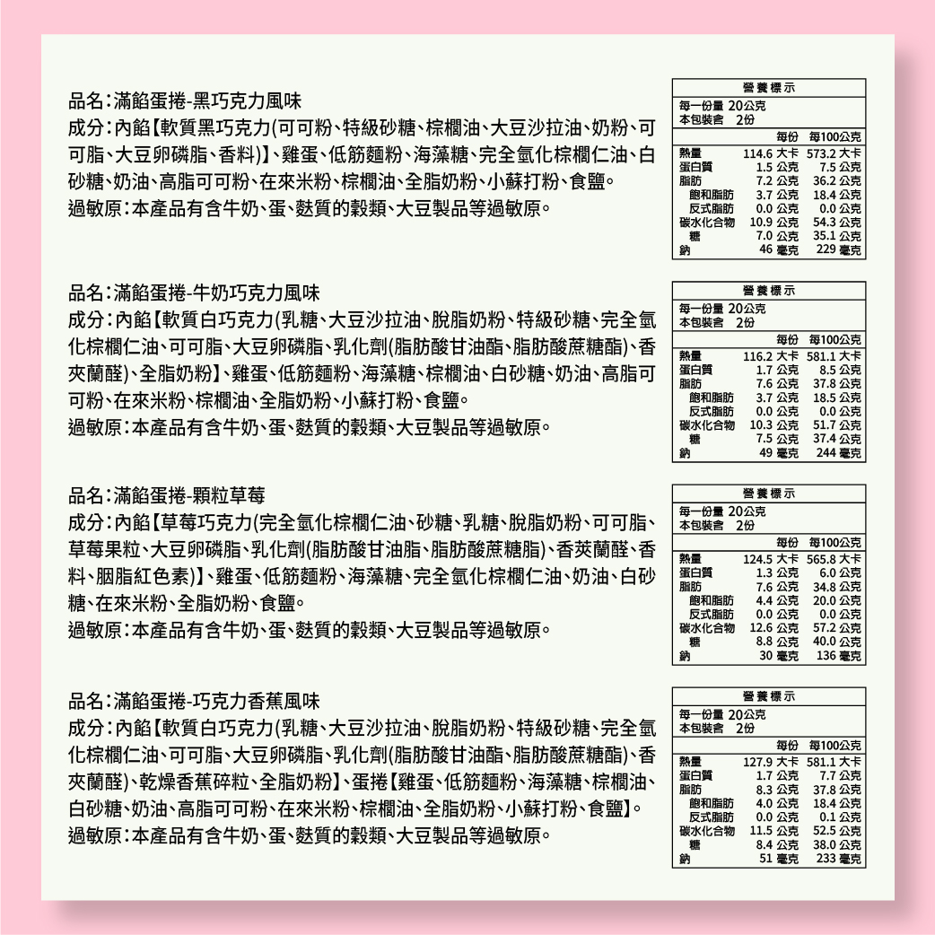 ▶ 滿餡蛋捲|每種口味2支,共12支 • 巧克力香蕉 • 顆粒草莓 • 原味檸檬 • 牛奶巧克力 • 黑巧克力 • 肉鬆