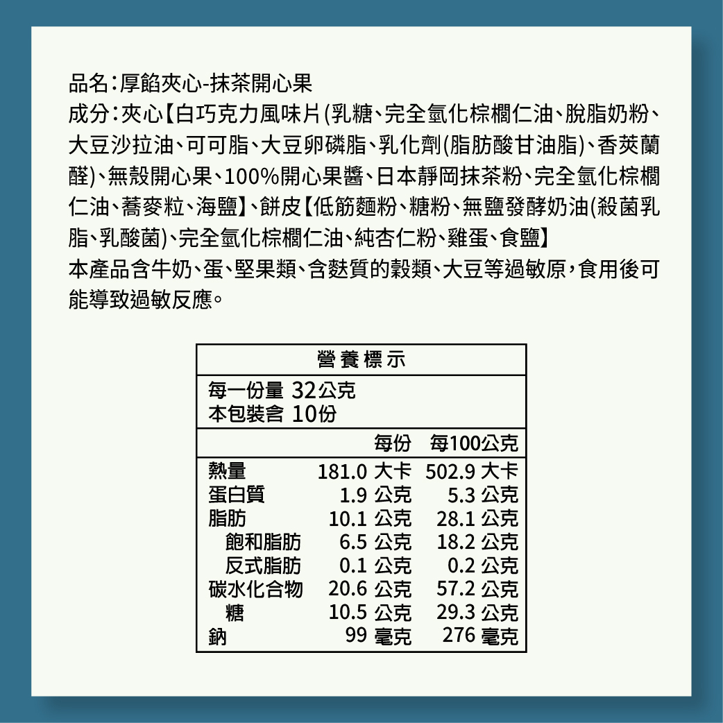 嚴選日本靜岡抹茶粉,融合 100% 開心果醬與果仁碎粒,厚餡層層堆疊,由酥脆餅體完美封存。 抹茶的微苦回甘與開心果的濃醇油香在口中交織,香氣深沈、餘韻綿長,是難得一見的厚餡風味。